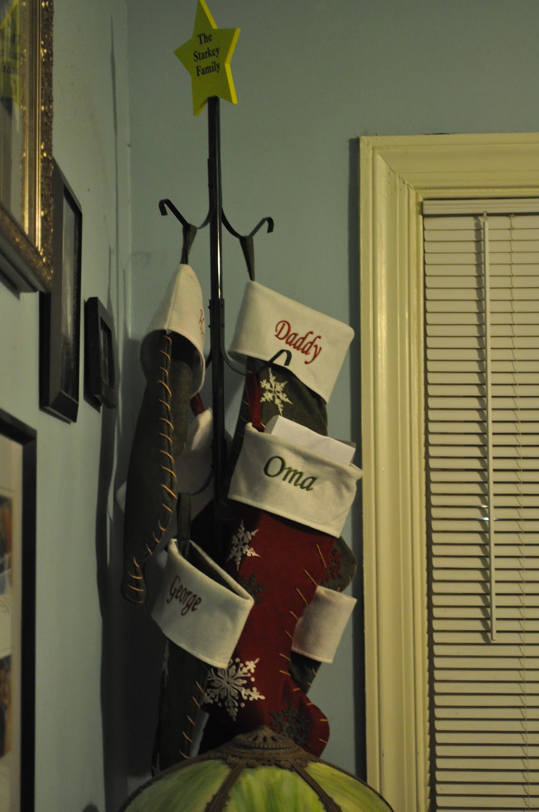 We have no fireplace or even a mantle, for that matter. I found this stocking tree online somewhere and thought it was perfect for our situation. It actually says "Starkey Family" at the top. Love it.